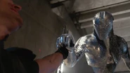 - Organische Stahlform / Metall-Exoskelett: Colossus kann die Gewebe seines ganzen Körpers in eine organische, stahlähnliche Substanz umwandeln. Diese Substanz, die Stahl ähnelt, ist von unbekannter Komposition, scheint aber analog zu Osmium und Kohlenstoffstahl zu sein. Er ist in der Lage, in diesen rüstungsähnlichen Zustand nach Belieben umzuwandeln (der Prozeß ist praktisch augenblicklich) und bleibt in dieser Form für eine noch unbestimmte Zeit. Einmal in seiner gepanzerten Form bleibt er so, bis er sich bewusst wieder normalisiert. Während im gepanzerten Zustand besitzt Colossus denselben Grad an Mobilität, den er in seiner normalen Form macht.