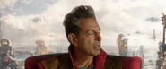 - Die Kleidung ist eine Referenz an das Erscheinungsbild des Grandmasters in den Comics: Dort hat er blaue Haut, rote Augen und trägt goldene Kleidung.