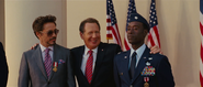 Später, nachdem Tony die Angriffe der Zehn Ringe im Nahen Osten beendet hatte und er auf seinen Rückflug von Kampfflugzeugen der Airforce angegriffen wurde, lügt Rhodey bei einer Pressekonferenz um seinen Freund zu schützen. Als Tony in den Kampf gegen den Iron Monger ziehen will, bittet er Rhodey, den Himmel für ihn freizuhalten.